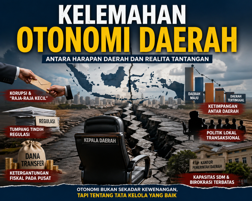 Lebih dari dua dekade sejak era Reformasi 1998, desentralisasi telah membuka ruang besar bagi pemerintah daerah untuk menentukan arah pembangunan. Namun di lapangan, berbagai persoalan menunjukkan bahwa otonomi belum sepenuhnya berjalan ideal.